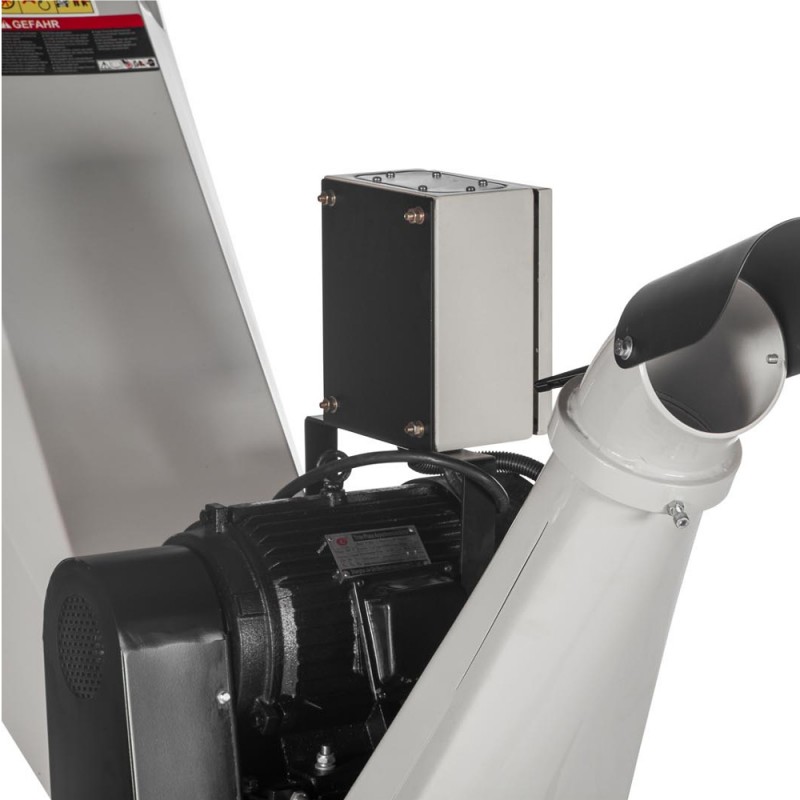 De houtsnippers worden door de afvoerbuis hoog uit de machine geworpen en de richt-plaat bepaald de uitworp stand. De inworptrechter is scharnierbaar waardoor u de trommel zeer eenvoudig kunt reinigen en de uitworptrechter is verstelbaar waardoor deze in elke richting verdraait kan worden. U kunt dus zelf bepalen waar u de opvangzak (kruiwagen, aanhanger etc.) neerzet want de schacht kan naar alle zijden worden ingesteld. De zeer robuuste inworpschacht is scharnierbaar gemaakt waardoor u bij verstoppingen, schoonmaken of vervanging van de messen eenvoudig de invoerschacht naar een zijde kunt laten zakken.