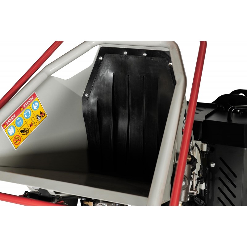 De houtsnippers worden door de afvoerbuis hoog uit de machine geworpen en de richtplaat bepaald de uitworp stand. De uitworpschacht is verstelbaar. U kunt dus zelf bepalen waar u de opvangzak (kruiwagen, aanhanger etc.) neerzet want de schacht kan naar alle zijden worden ingesteld. De zeer robuuste inworpschacht is scharnierbaar gemaakt waardoor u bij verstoppingen, schoonmaken of vervanging van de messen eenvoudig de invoerschacht naar een zijde kunt laten zakken. De machine kan zowel takken, struiken, hagen etc. perfect verhakselen. Ook groenafval (zoals snoeiafval van een conifeer) kunt U door de hakselaar laten verkleinen maar de machine is niet geschikt voor alleen loofafval (zoals bijv. varens). U kunt het verhakselde materiaal natuurlijk perfect als bodembedekking gebruiken.