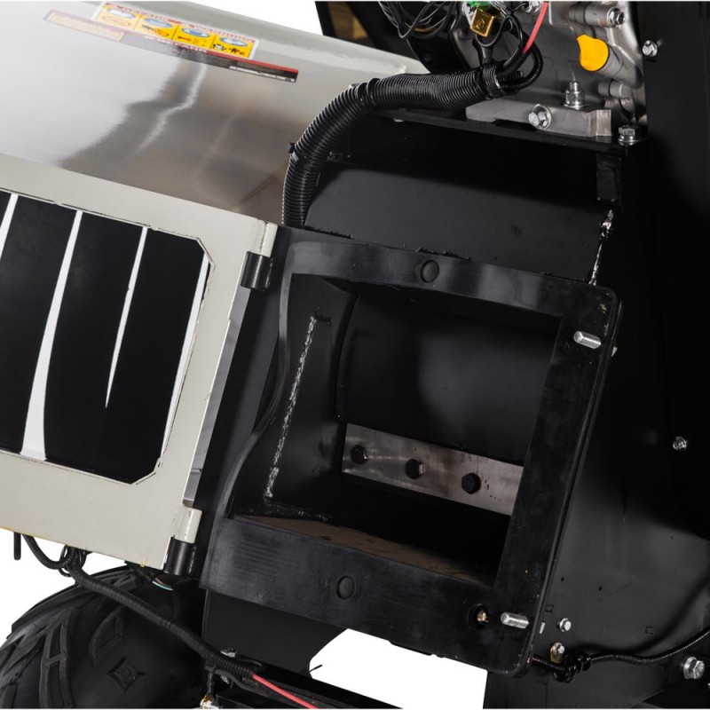 De machine kan zeer eenvoudig verplaatst worden door de grote luchtbanden en trekhaak aansluiting (alleen transport op eigen terrein is toegestaan). De machine is voorzien van 4 wielen waarvan 2 zwenkwielen. De as waaraan deze zwenkwielen zijn gemonteerd is een pendelas dus ook geschikt voor oneffen terrein. Met zijn breedte van 79cm kan de machine door elke poort (wiel basis breedte 75cm!) De uitworptrechter is verstelbaar naar links en rechts en ook de uitworp hoogte is eenvoudig in te stellen. De inworptrechter is scharnierbaar waardoor u deze eenvoudig kunt openen voor bijvoorbeeld schoonmaak werkzaamheden.