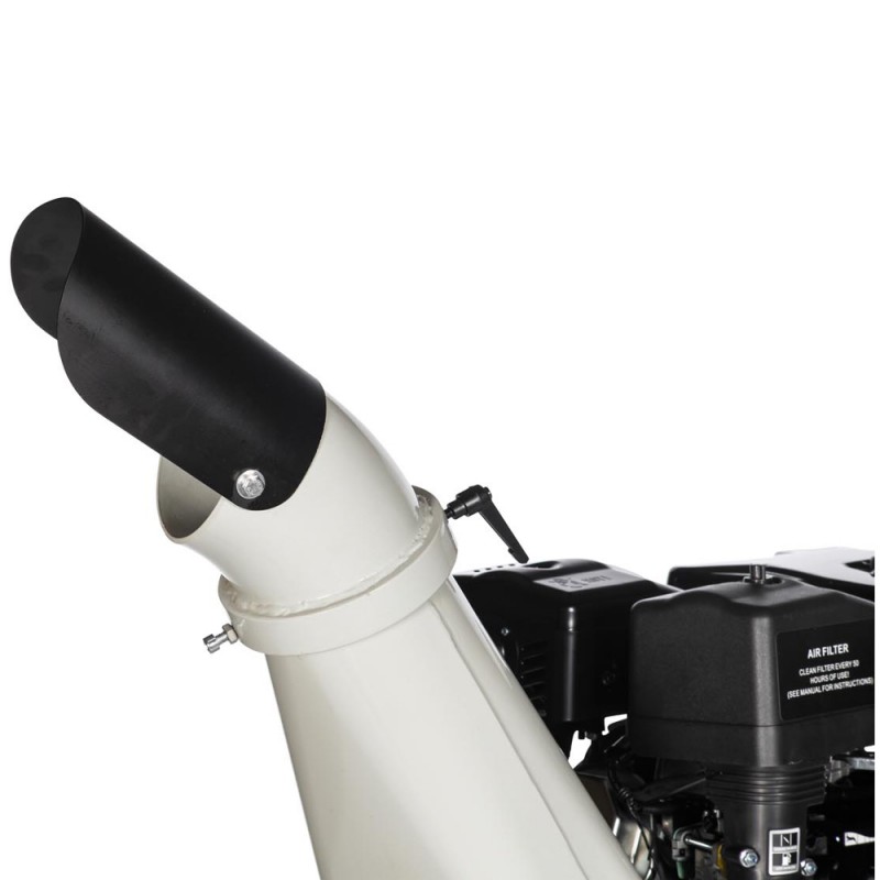 De zeer robuuste inworpschacht is scharnierbaar gemaakt waardoor u bij verstoppingen, schoonmaken of vervanging van de messen eenvoudig de schacht naar één zijde kunt laten kantelen. De houtsnippers worden door de afvoerbuis (hoog) uit de machine geworpen en de richt-plaat bepaald de uitworp richting. De uitworptrechter is ook scharnierbaar en daardoor het schoonmaken ook zeer eenvoudig! De uitworptrechter is ook verstelbaar. U kunt dus zelf bepalen waar u de opvangzak (kruiwagen, aanhanger etc.) neerzet want de schacht kan naar alle zijden worden ingesteld. De machine is tevens voorzien van een elektronische uren teller. Dit is eigenlijk een service indicator en is vooral handig om te bepalen wanneer uw machine aan een onderhoudsbeurt toe is of wanneer u olie moet verversen! Daarnaast ontvangt U nu ook gratis een afdekhoes waardoor u de machine “stofvrij” kunt wegzetten.